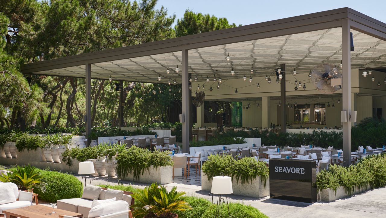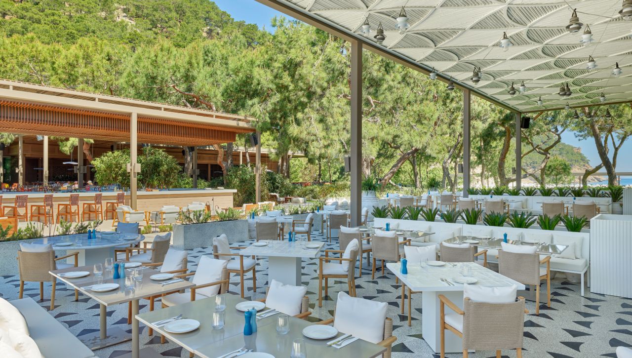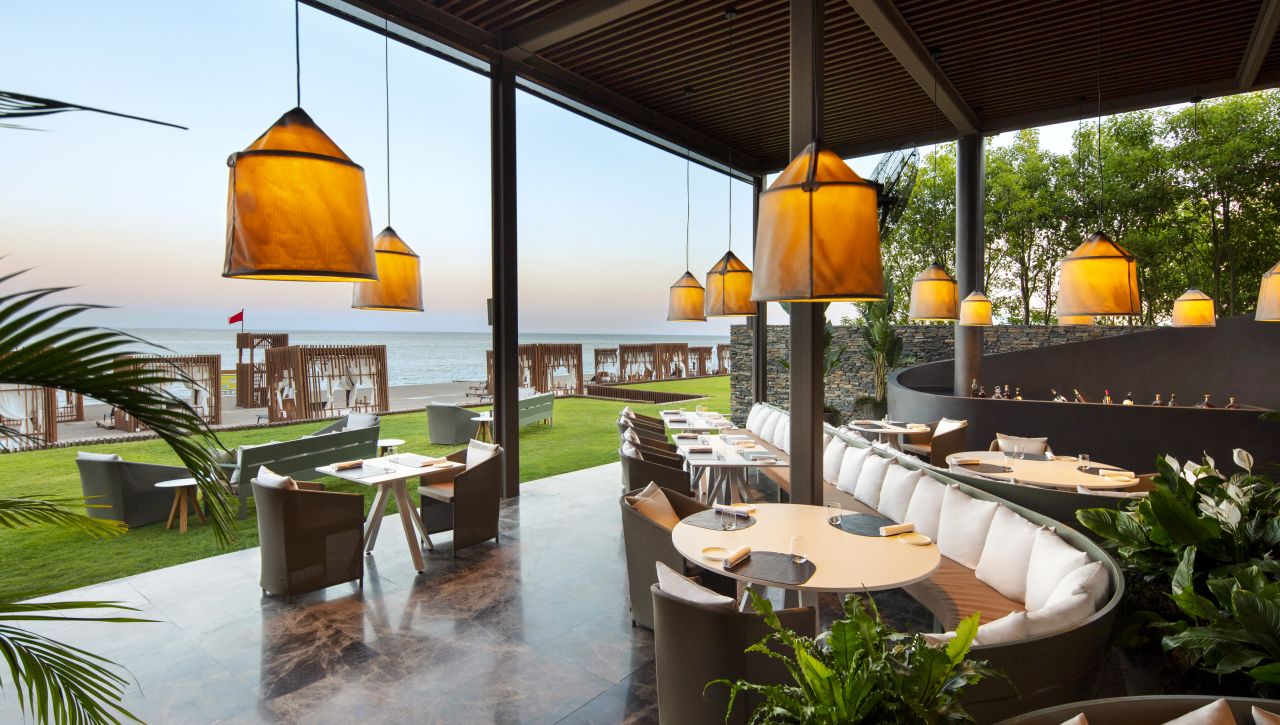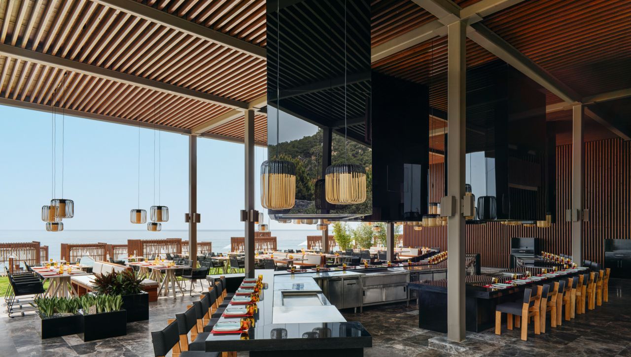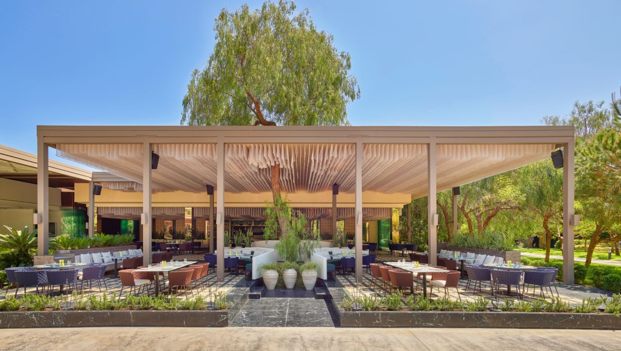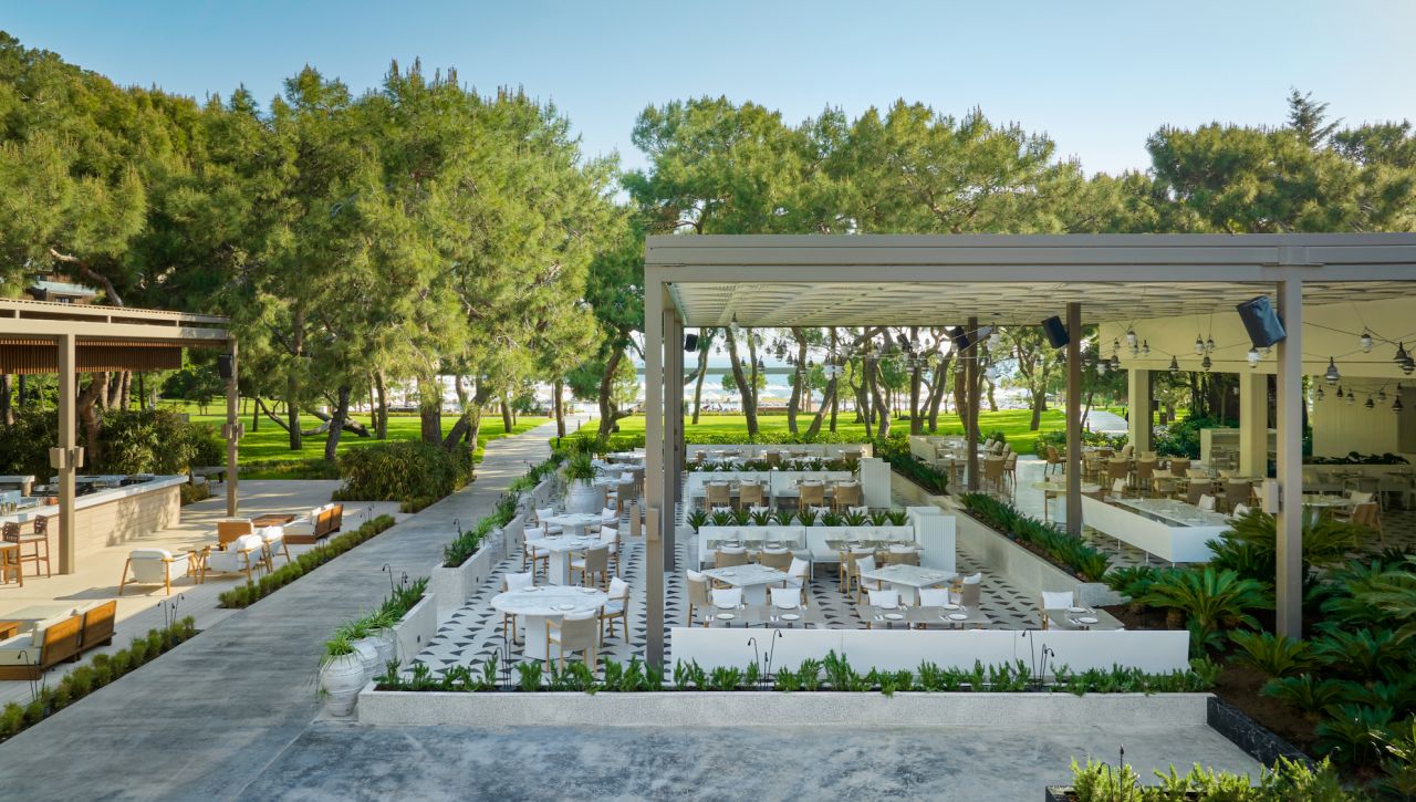 Hosté si mohou vychutnat bohatý výběr gastronomických možností, který zahrnuje hlavní bufetovou restauraci, tematické à la carte restaurace (například středomořské, asijské či steakové speciality), formální bary, snack bary u bazénu i plážové pavilony. Ultra all‑inclusive formule pokrývá jídla i nápoje během celého dne, včetně prémiových alkoholických i nealkoholických nápojů.