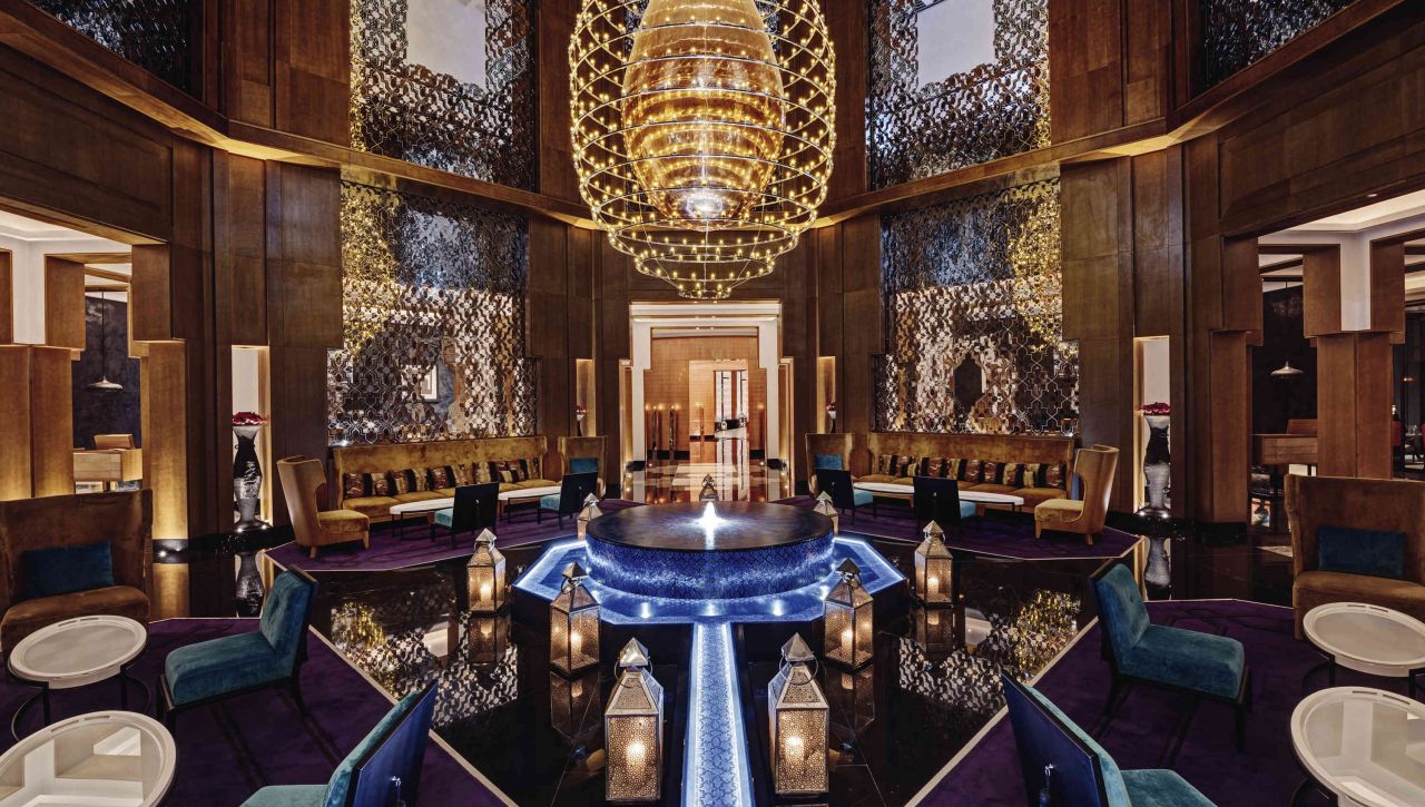 Design hotelu citlivě propojuje moderní eleganci se symbolikou tradiční marocké architektury. Vysoké oblouky, ornamentální stropy, mozaikové vzory a měkké světlo vytvářejí atmosféru, která vás okamžitě pohltí. Interiéry hrají teplými tóny písku, bronzu a modrého kobaltu, připomínajícími barvy saharské krajiny i staré mediny.