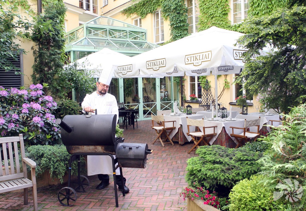 Pestrá snídaně formou bufetu je připravená každé ráno v elegantní hotelové restauraci, ve které se podávají jídla litevské a francouzské kuchyně. Hotelová kavárna Stikliai nabízí lehká jídla, zákusky a kávu.